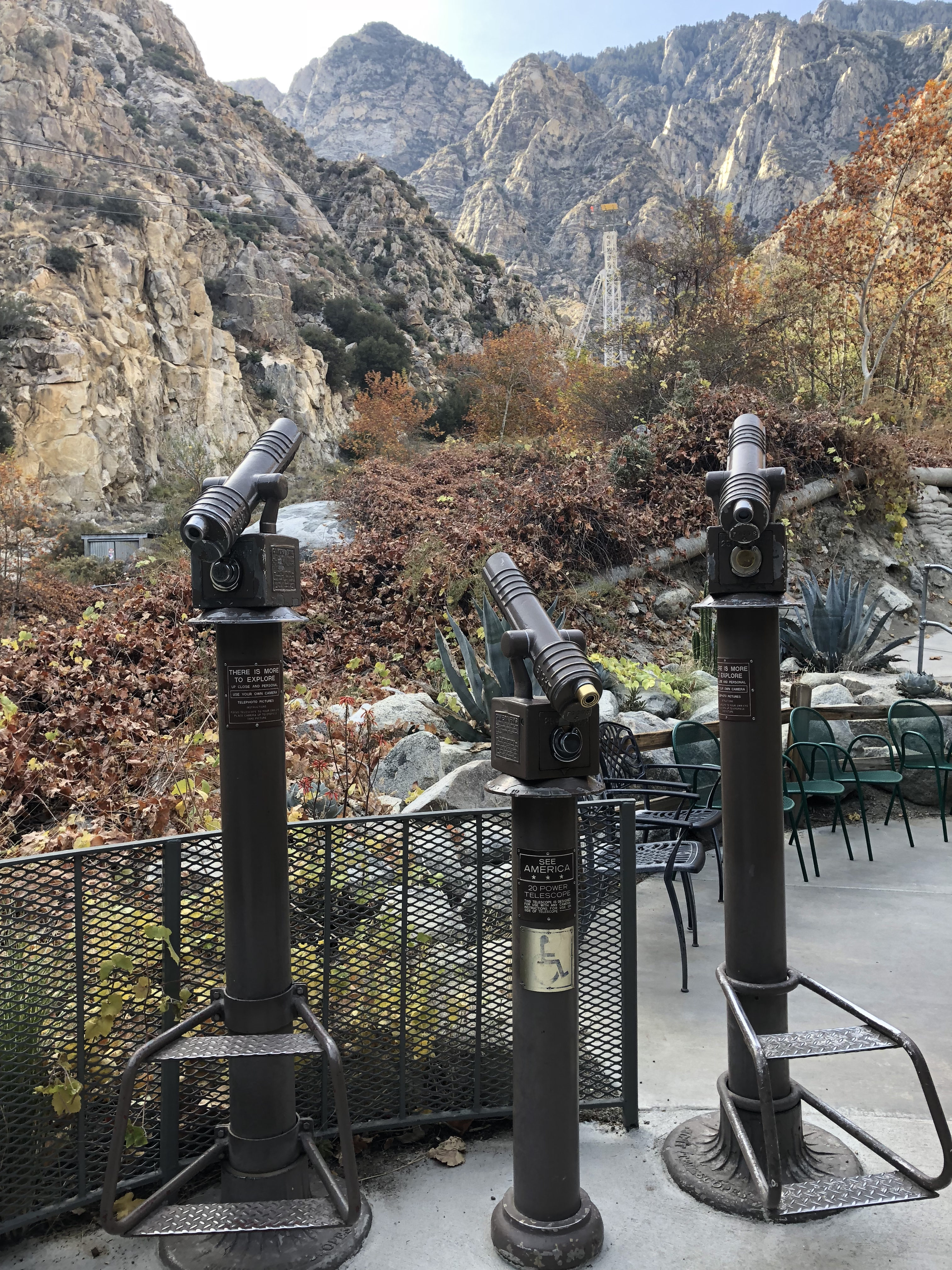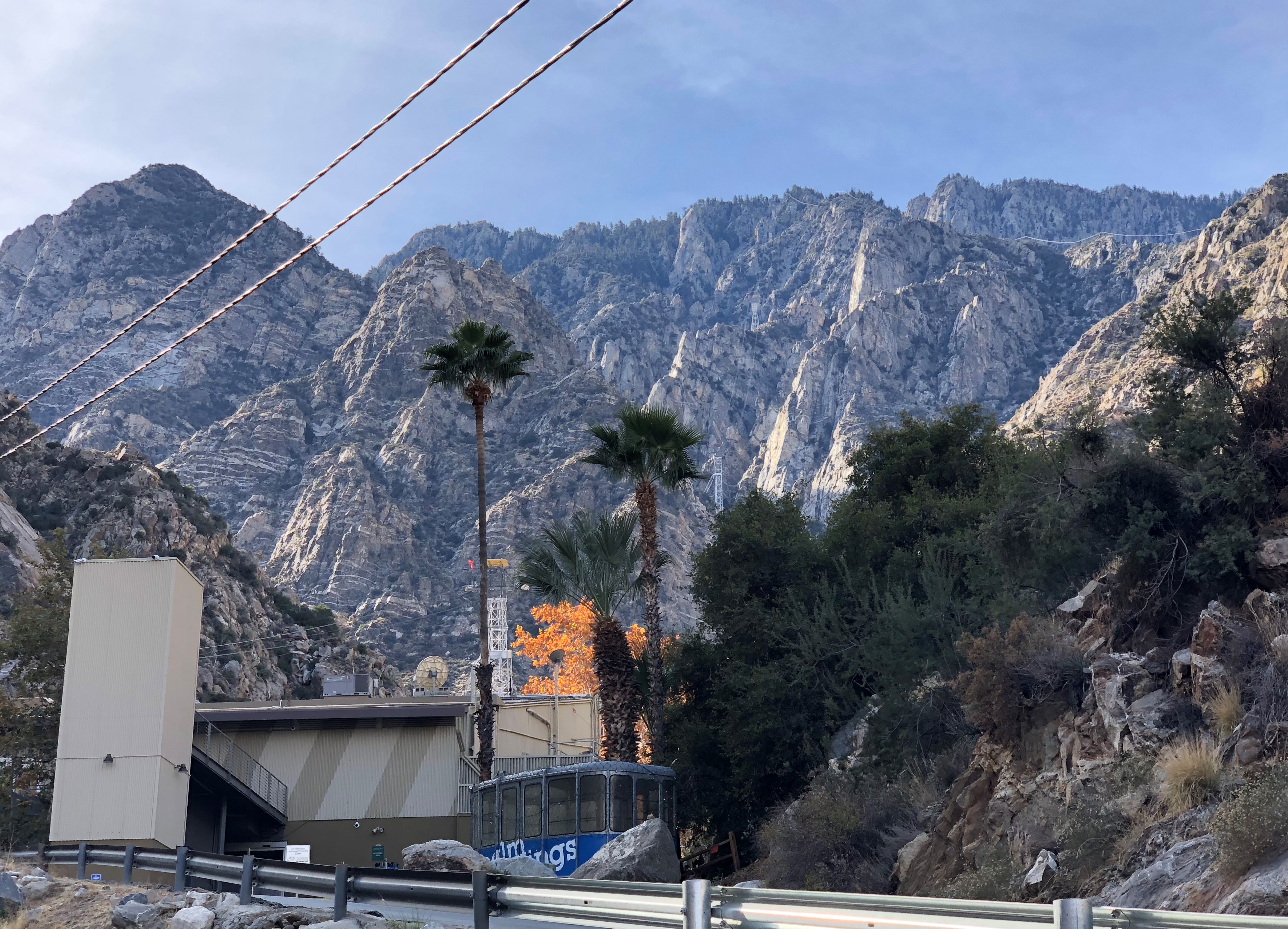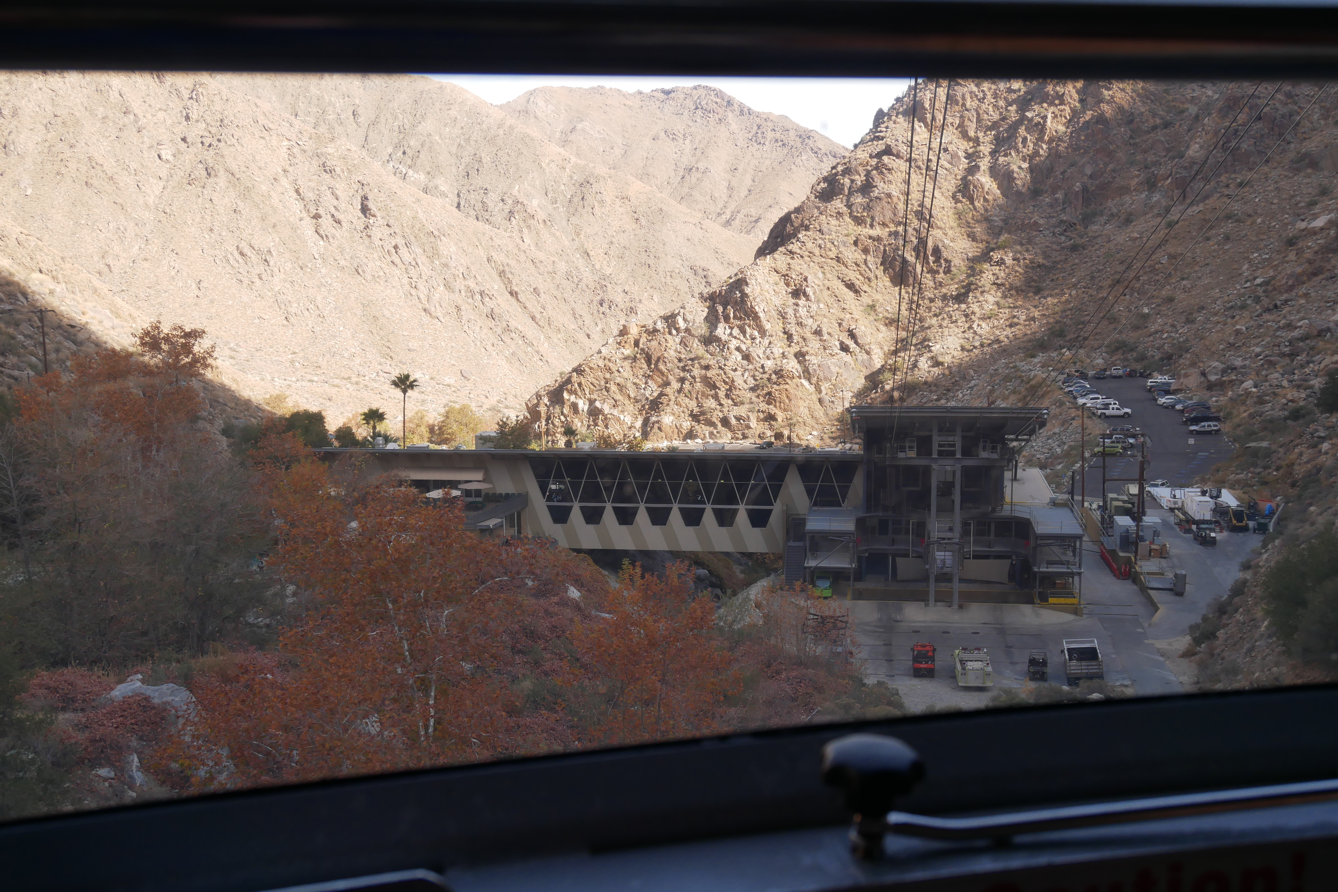 On the ride back down, we were able to get some good views of the Coachella Valley floor and the helicopter landing pads on the tramway’s upper towers. Even though we visited in late December, the San Jacinto Mountains did not have snow, yet, and we saw many trees showing fall colors around Valley Station.