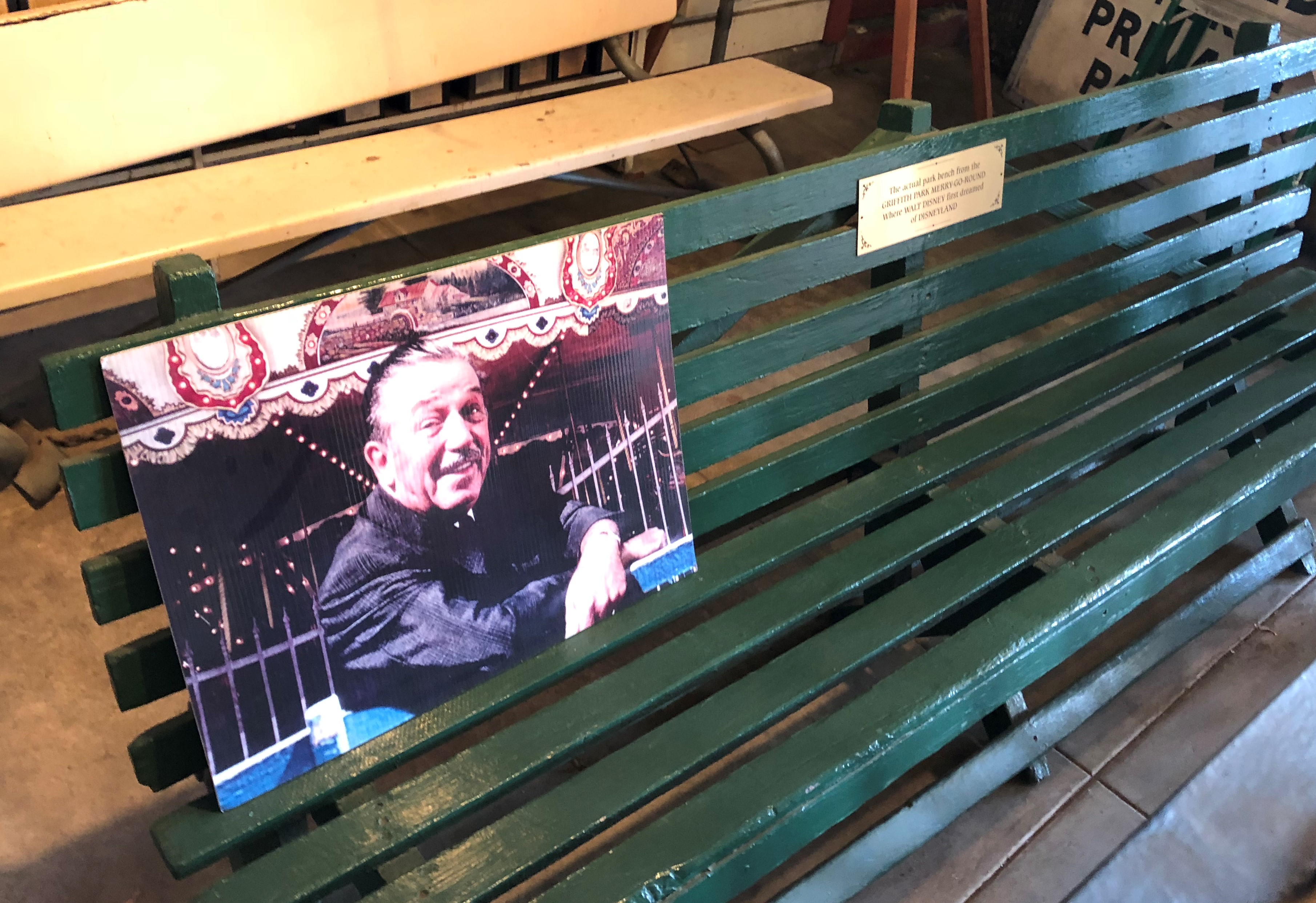 The bench where Walt Disney would sit when he frequented the carousel on weekends with his young daughters. | Photo credit: Krista