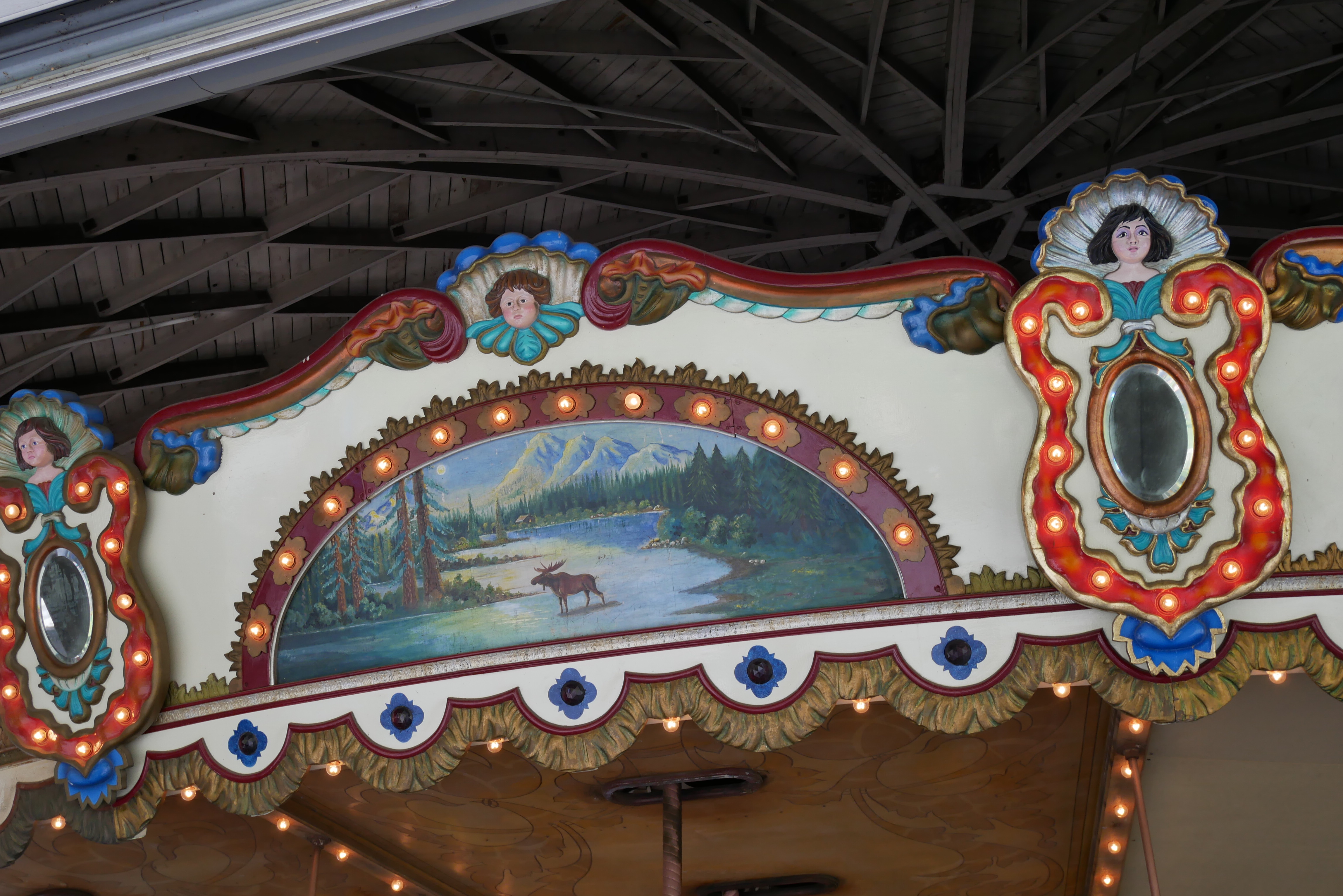 Little by little the artwork on the Griffith Park Merry-go-Round is being restored by volunteers. This section was recently completed. | Photo credit: Krista