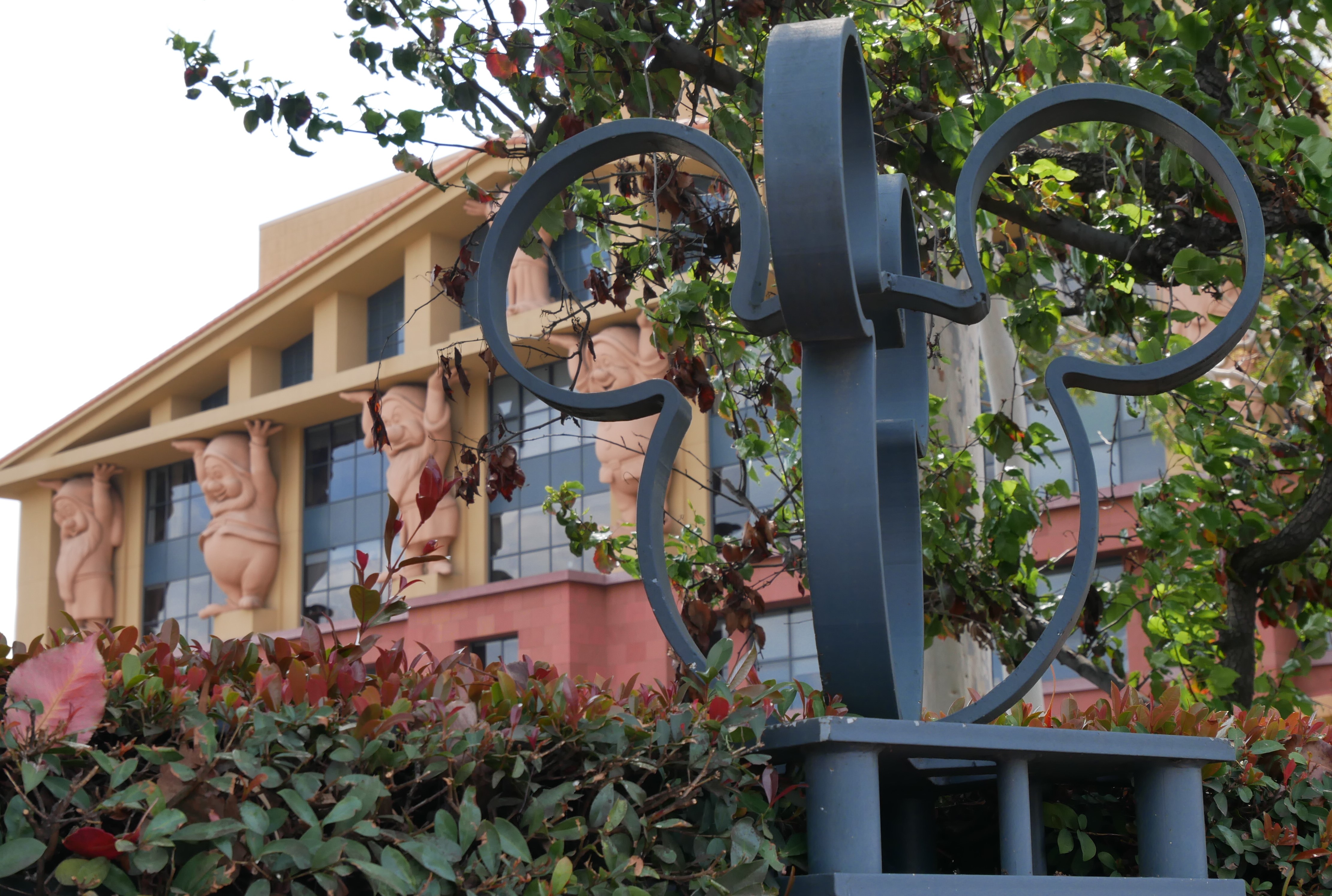 Walt Disney Studios front gate area with the the Seven Dwarfs in the background as they overlook the Disney Legends Plaza and greet all who enter the front of the Team Disney Building. You can see them for blocks around the Disney Studios in Burbank. They are a landmark reminder of the influence Snow White and the Seven Dwarfs continues to have on The Walt Disney Company. | Photo credit: Krista